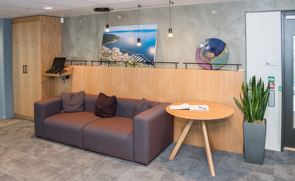 Trondheim Havn I.nr.: 51029 - Fil: DSC_0587.jpg Garderobeskap og vegg foran sofa. På toppen av fast vegg er det svart stålbøyler. Også med skråstilt hylle for laptop. Design:tegn_3 Foto:Johan Martin Lium Kunde:Trondheim Havn AS Forrige Tilbake Neste