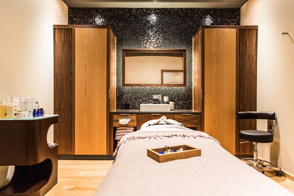 Innredning ble levert i en kombinasjon av eik finer og amr. valnøtt finer. Speilramme i valnøtt heltre. Alt i mattlakkert utførelse. Benkeplate i type Silestone. Dette er en plate som består av 94% naturlig kvarts og den har bakteriostatisk beskyttelse.