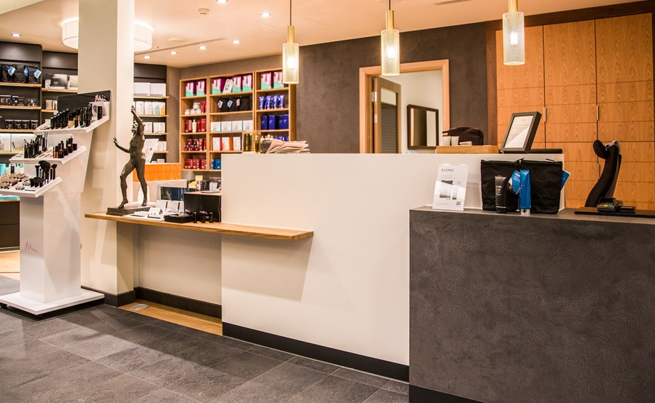Skranke i hvit laminat F-2255 med sokkel i mørk grå laminat. Benkeplater er her med eik heltre. På innsiden av denne er det også elektrisk hev/senkbar tastaturplate. På den grå kasse til høyre ble det pålimt flis av vår kunde på plassen ved montering.