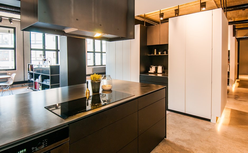 Bak så ser vi et skapoppsett med integrert kjøleskap. Dører på høyskap i hvit laminat F-2255. Skrogdeler i svart gjennomfarget MDF som er mattlakkert.