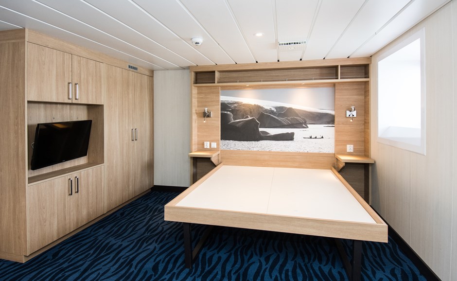 Vi er nå nettopp ferdig med en stor leveranse av innredning til hurtigruteskipet MS Spitsbergen. Vi leverte all innredning på lugarer. Bildet her viser en av de større passasjerlugarene. All innredning med eik laminat F-5374 NAT.
