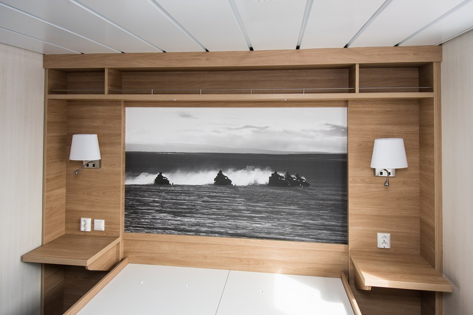 Hurtigruteskipet MS Spitsbergen I.nr.: 51485 - Fil: bilde-2-spitsbergen-dsc_0519 Bilde viser hodegavler bak senger. Med nattbord og sidekasser med plass for å trekke ledninger til strøm bak. Hyller øverst er her med reiler i rustfri stang ø-6mm. Design:Tillberg Design Foto:Johan Martin Lium Kunde:Fosenyard AS Forrige Tilbake Neste