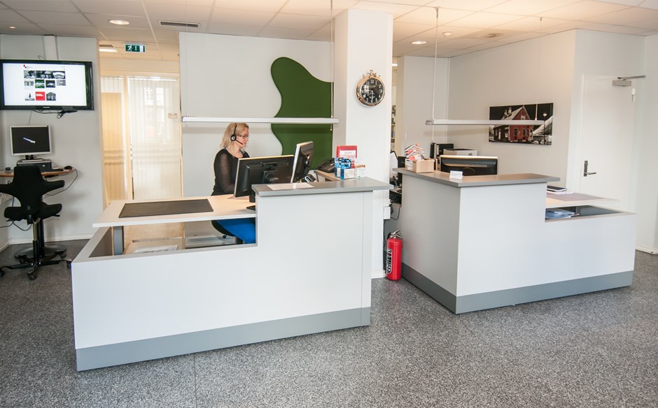 Vi leverte flere skranker/arbeidsplasser til Servicetorget ved Tinn kommune på Rjukan. Vår kunde har levert el. hev./senk skrivebord bak skrankefrontene. Vangene er utført i Formica K-7927 og K-7928 på diskplater og sokler.