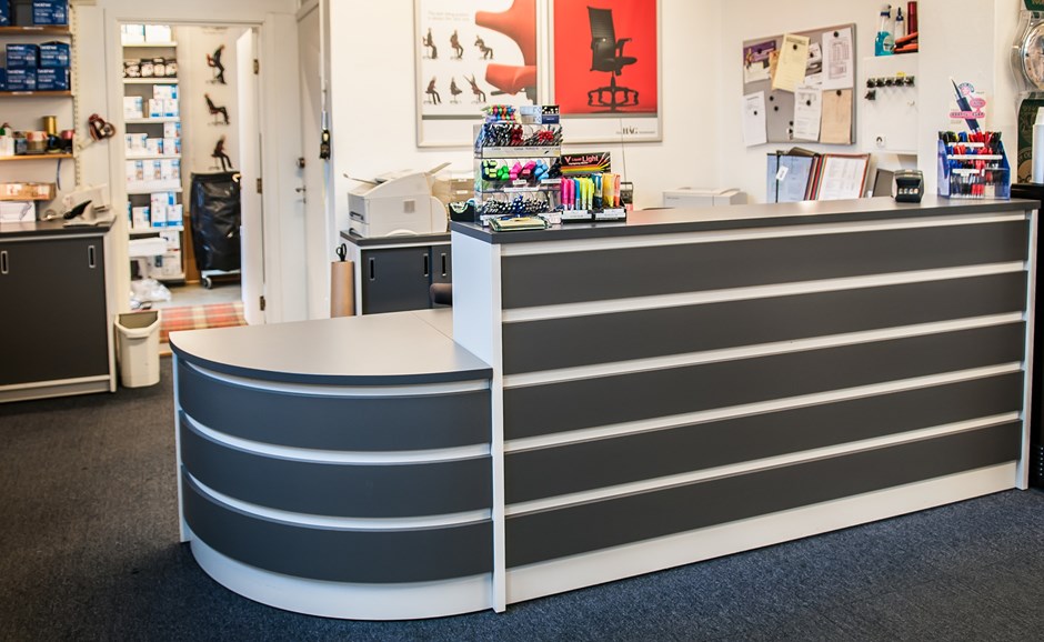 Skranke utført i grå laminat F-7912 og Folkstone F-7927. Buet hjørneseksjon med nedsenket plate for eventuell ekspedering av rullestolbruker. Skap med skyvedører og skuffeseksjon i samme utførelse.