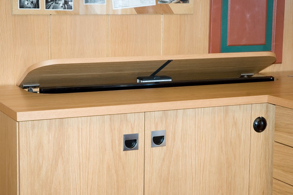 TV-skap med skuffeseksjon og innebygget kjøleskap. El hev/senk av TV med fjernkontroll. Utført i eik.