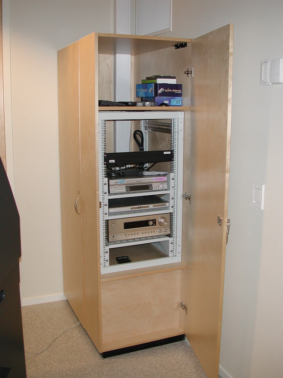 Skap for av-utstyr. Tilpasset teknisk utstyr med tilgang fra to sider. Design:OLM/kunde. Forrige Tilbake Neste