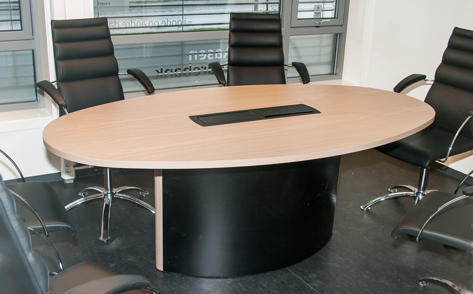 Aasen Sparebank I.nr.: 50750 - Fil: BSC_9645 Møtebord med ovalt svart understell og plate i eik med inn polert grå Osmo leire. Foto:Johan Martin Lium Kunde:Kontor Design AS Forrige Tilbake Neste