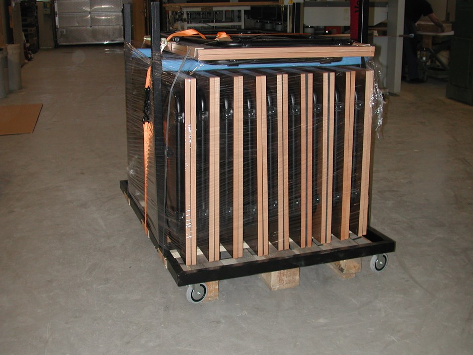 Lager og transportralle. Kan leveres med tralle for lager og transport. Inntil 20 bord pr.tralle. Solide låsbasre hjul. Design:OLM Forrige Tilbake Neste