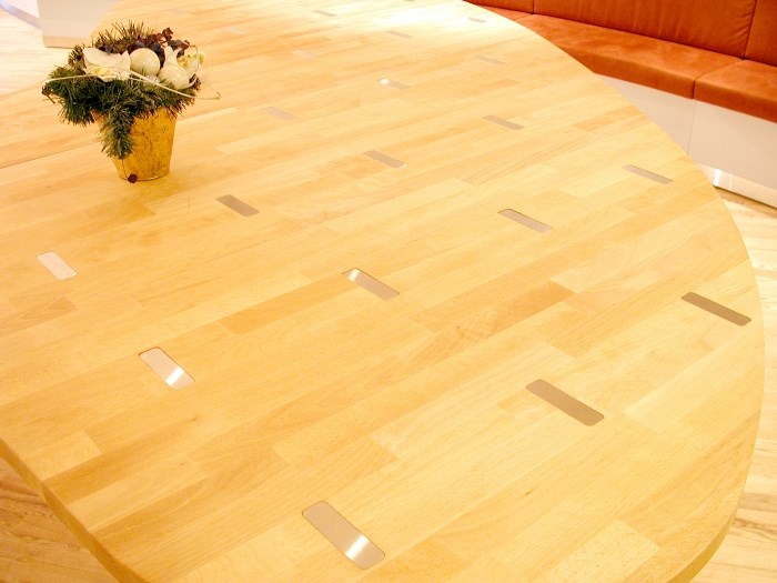 27172 - 0849 Serveringsbar. Plater i bøk med innfrest dekorplater av rustfritt stål. Glassplater i bena, montert sammen med rustfrie beslag. Design:OLM/Kunde Forrige Tilbake Neste