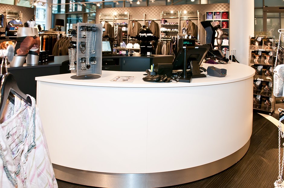 40197 9672 Skranke i klessbutikk Salgsskranke i butikk bestående av to buede elementer som danner deler av en sirkel. En i hvit Formica K-1040 og en i mørk grå F-2297. Skranken har innredning med skap, hyller og skuffer. Design:OLM/Kunde Forrige Tilbake Neste