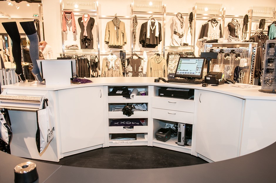 40197 9679 Skranke i klessbutikk Salgsskranke i butikk bestående av to buede elementer som danner deler av en sirkel. En i hvit Formica K-1040 og en i mørk grå F-2297. Skranken har innredning med skap, hyller og skuffer. Design:OLM/Kunde Forrige Tilbake Neste