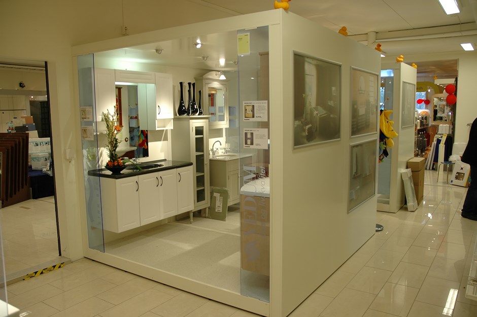 0446 Salgsvegg i VVS butikk Innredning i høytrykkslaminat i butikker for VVS Design:OLM/Kunde Forrige Tilbake Neste