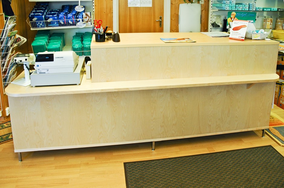1273"Kjøpmannsdisk" Liten skranke med plass for kasseapparat og mange skuffer på baksida. Design:OLM/Kunde Forrige Tilbake Neste