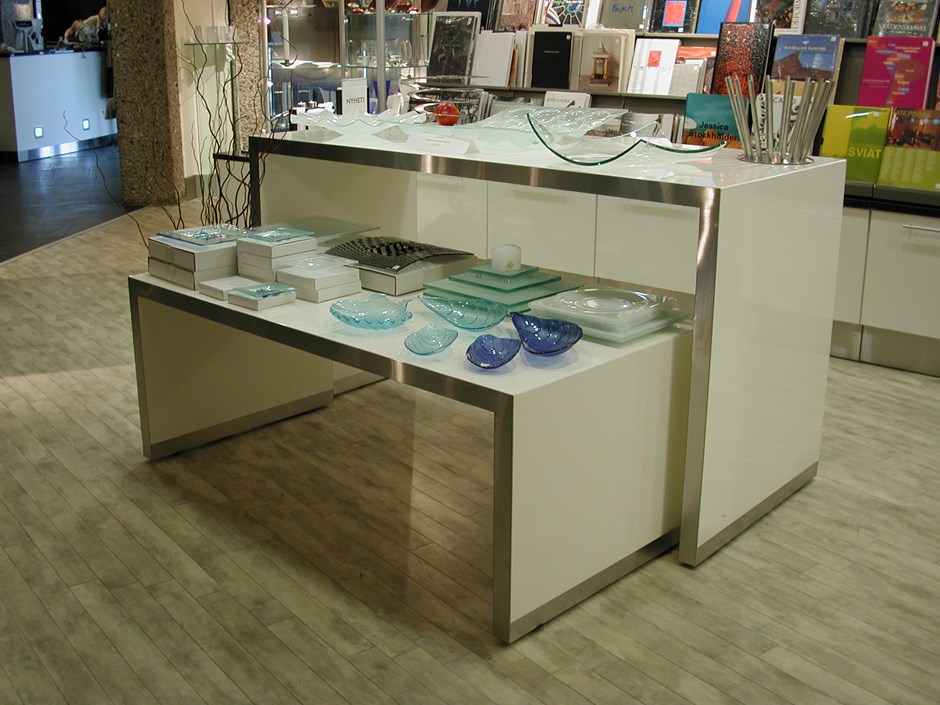 1813 Trapp eksponeringsbord. Salgs/eksponeringsbord i høytrykkslaminat hvit K-1040. Design:OLM/Kunde Forrige Tilbake Neste