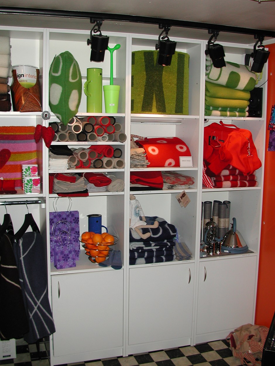 3126 Butikk-innredning. Profileringsvegg for klær i butikk. Hyller rom og skap. Design:OLM/Kunde Forrige Tilbake Neste