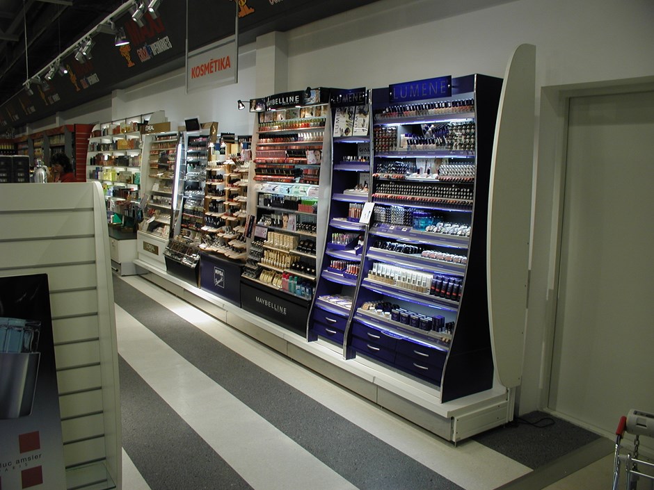 Salsreoler i parfyneri. Utført i høytrykkslaminat.