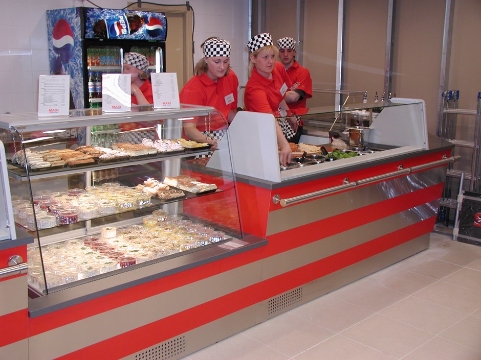 Tilpasset glassmonter for bakervarer. Flerfarge front.