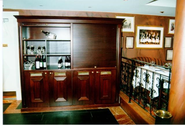 00159 Skap for dispensere mm. 00159 Utført i finert/heltre mahogny. Sjalusidører i overskap. Slagdører med fylling i underskap. Design:OLM/Kunde Forrige Tilbake Neste