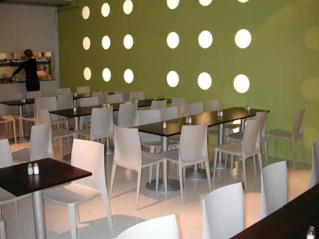 Kvadratiske kaffebord i kantine.