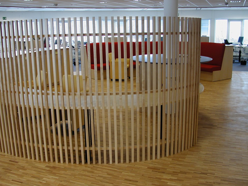 25082 - 9652 Kaffebar. Skjermvegg utført som spiler av heltre lønn. Design:OLM/Kunde Forrige Tilbake Neste