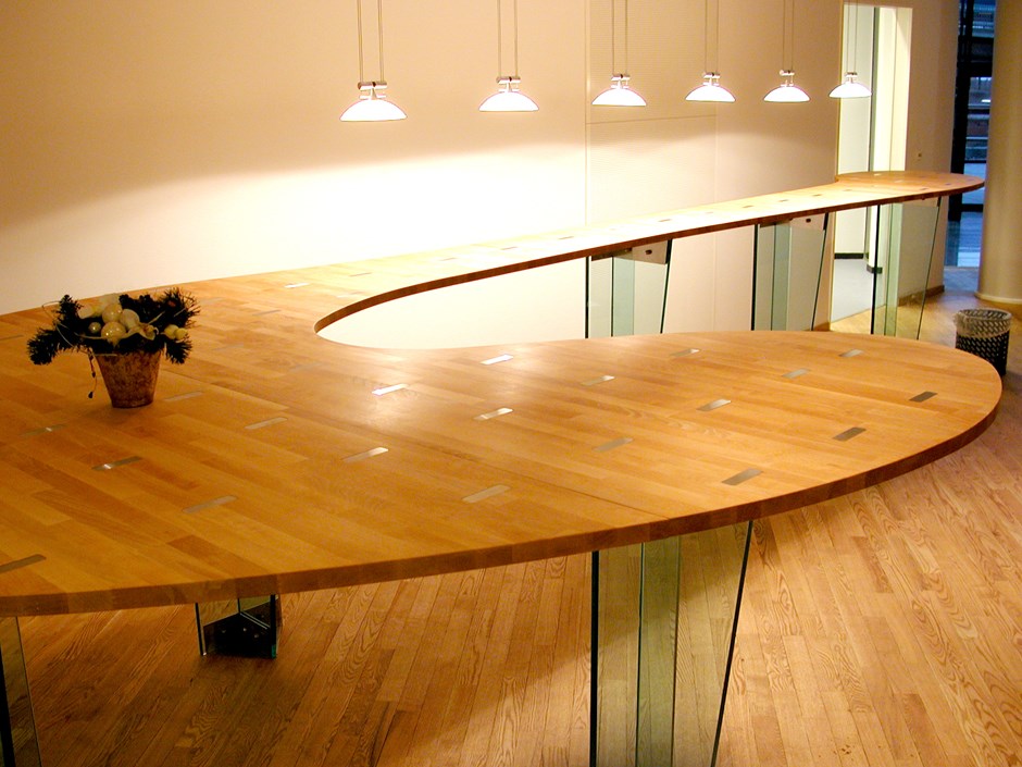 6402 Plate i "kaffebar". Bøk heltre med nedfreste rustfrie stålbiter. Ben i glass. Design:OLM/Kunde Forrige Tilbake Neste