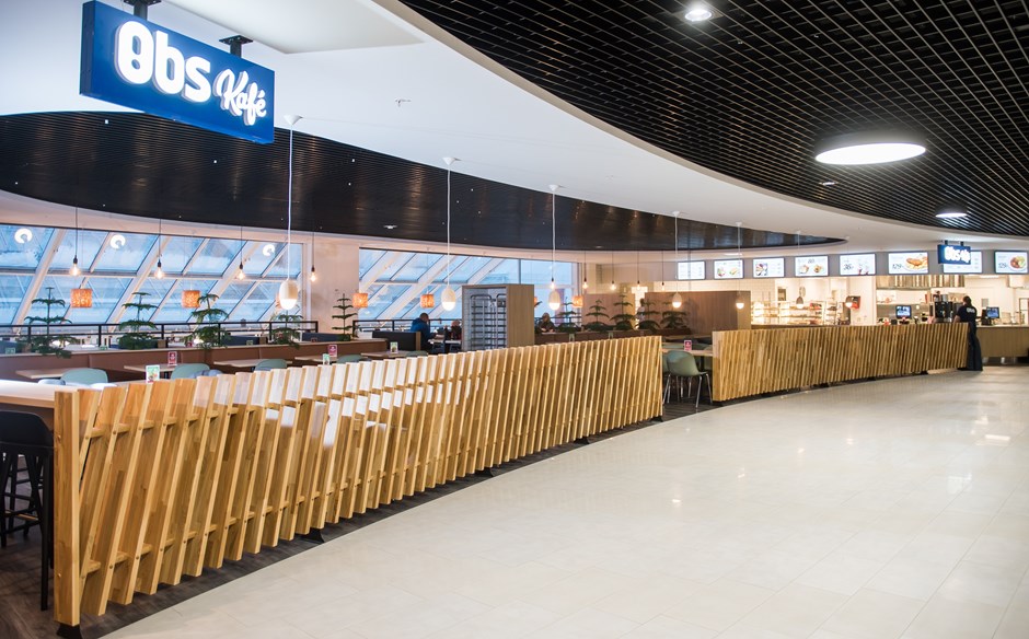 OBS City Syd i Trondheim har pusset opp hele kaféområdet i 3. etasje. Vår kunde Rupro AS, stod for leveringen der. Vi har levert all innredning i tre og laminatdeler. Kafé-området avgrenses av et «gjerde/skigard» av eikspiler.
