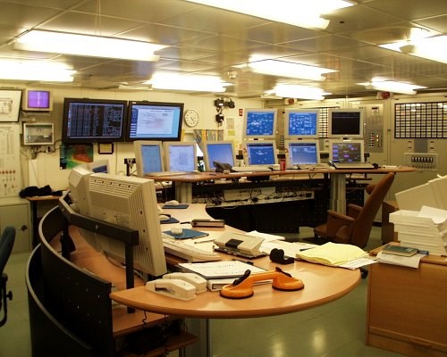 Bord i kontroll-rom. Todelt hovedplate. Nedsenket platedel for skjermer. Perforert frontpanel i metall på bakside av bordet - skjermer kabler mm. Forrige Tilbake Neste