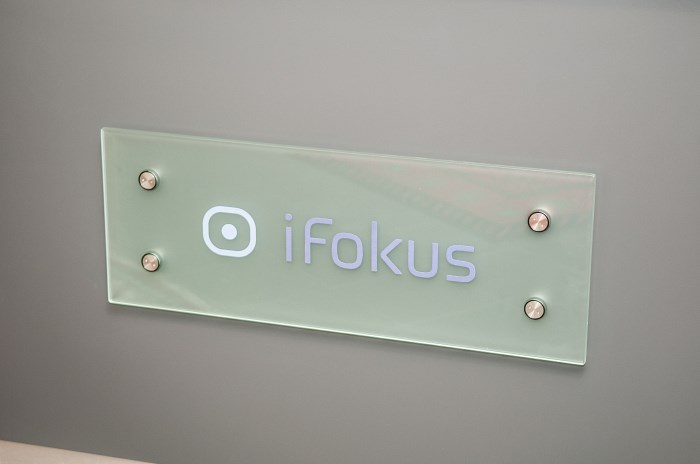 I Fokus sin logo er lagt på frostet glassplate.