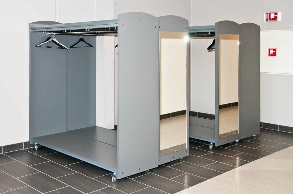 44144 Garderobe på hjul Garderobe på hjul med speil på en sidevange. 3-armet roterende kleskroker. Belagt med Formice F-7912. Design:OLM/Kunde Forrige Tilbake Neste