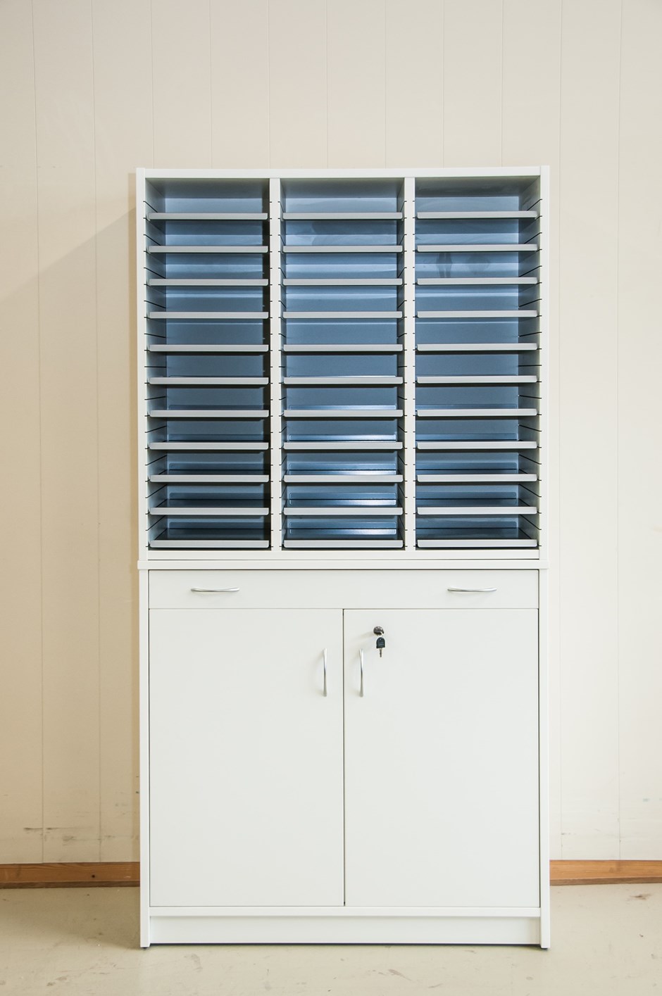 Detter er vår standard postreol med over og underdel. Uttrekkshylle for bruk under sortering. 33 rom. Underdelen har låsbare dører Størrelse kan tilpasses kundens behov.
