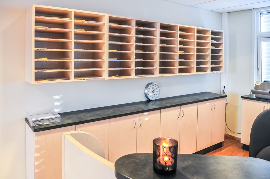 9404 Posthylle med arkiv og avlastningskap. Posthylle og avlastningskap er utført i samme materiale som skranke i respesjonen. Hylle og dører i bjørk med plate i skiferlaminat ST 245 15 Design:OLM/Kunde Forrige Tilbake Neste