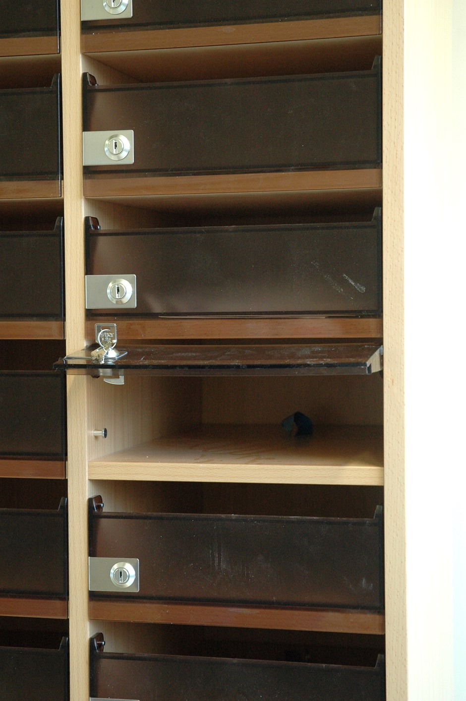 8217 Postreol Postreol med IP-luker. Låsbare luker i sotet plexi. Dører på baksida av reolen. Design:OLM/Kunde Forrige Tilbake Neste