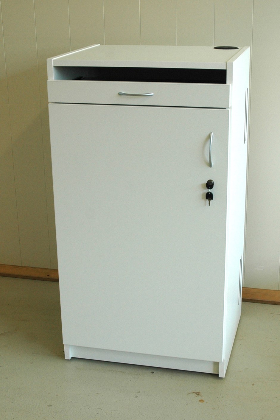 35206/4572 PC-skap Skap 50x56x110 cm Hvit laminat K-1040 Mål-farge-laminat og størrelse etter ønske. Tastaturhylle med åpning for god utlufting. Design:Kunde/OLM Forrige Tilbake Neste
