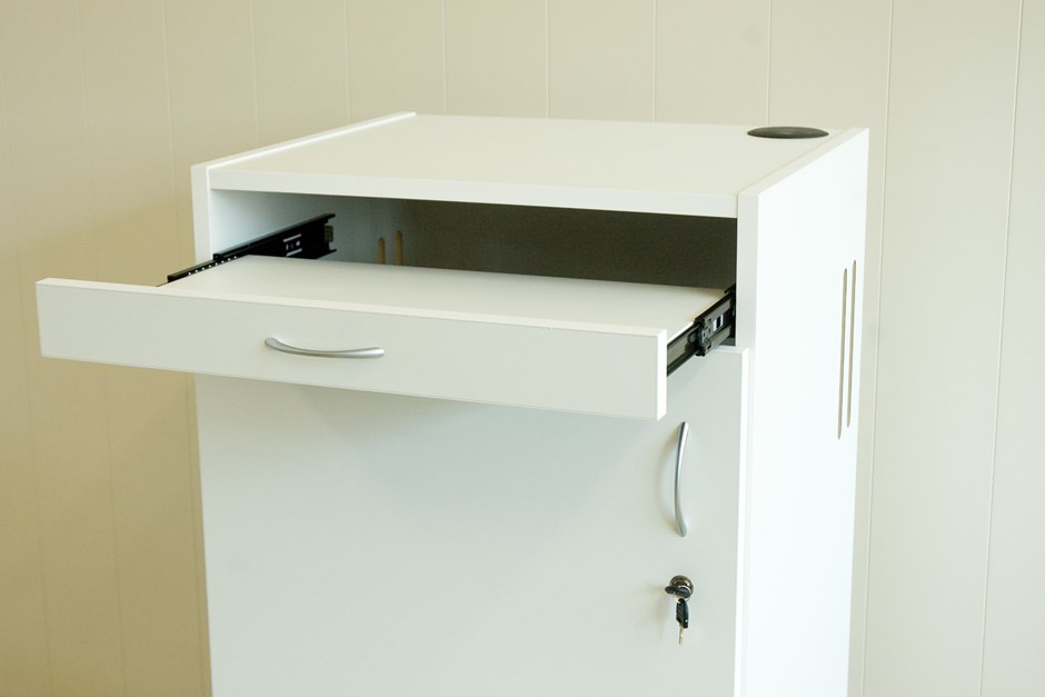 35206/4572 PC-skap Skap 50x56x110 cm Hvit laminat K-1040 Mål-farge-laminat og størrelse etter ønske. Tastaturhylle med åpning for god utlufting. Design:Kunde/OLM Forrige Tilbake Neste