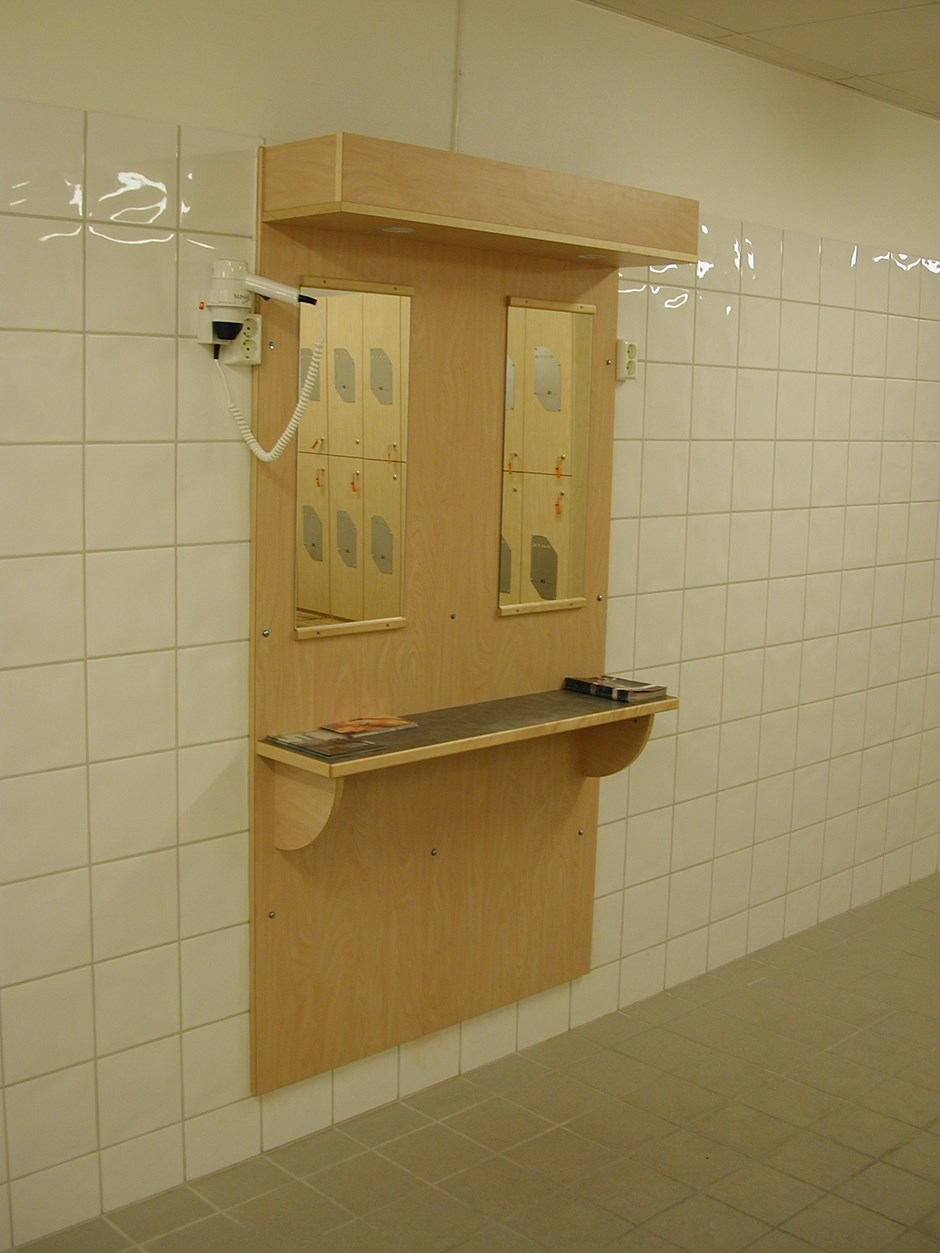 Speilhylle i garderobe. Hylle for tørk/føhn av hår. To speil og to føhnere. Design:OLM/kunde. Forrige Tilbake Neste