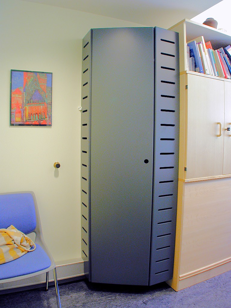 21884 0850 Garderobeskap. Garderobeskap tilpasset hjørne. Luftespalter. Fargelakkert MDF. Form og farge etter ønske. Design:Kunde-OLM Forrige Tilbake Neste