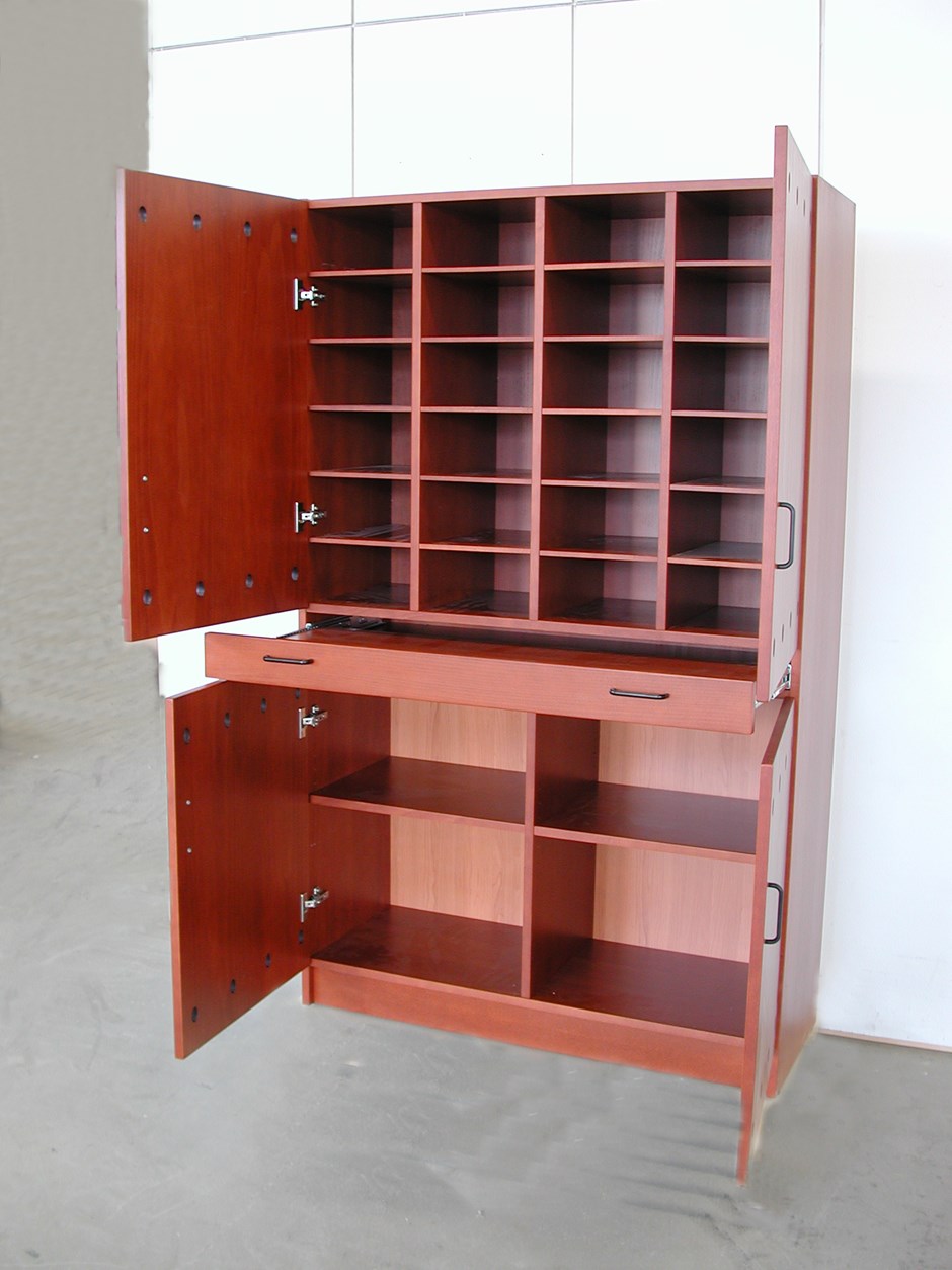 1883 Post-sorteringsskap. Overskap med 20 rom. Utrekkshylle. Underskap med regulerbare hyller. Skreddersyes etter kundens ønsker. Design:Kunde/OLM Forrige Tilbake Neste