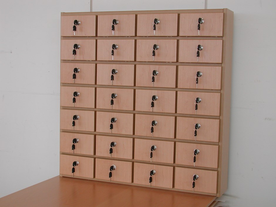 8888 Mobilskap. Skap med 28 låsbare rom bl.a. for lagring av mobiltelefoner. Vi lager akkurat den størrelsen kunden har behov for. Design:OLM/Kunde Forrige Tilbake Neste