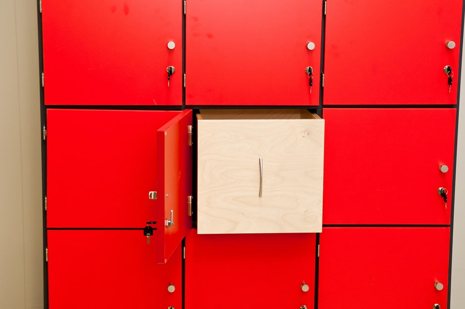 41173 Personalskap. Personalskap med 15 låsbare rom. Skrog i grå høytrykkslaminat F-7912, dører i rød høytrykkslaminat F-2824. Design:OLM/Kunde Forrige Tilbake Neste
