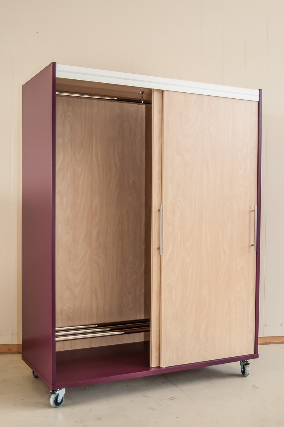 45825 Garderobeskap på hjul med skyvdører. Dører i bjørk høytrykkslamiant K-7024. Farbelakkert skrog i Mdf. Design:OLM/Kunde Forrige Tilbake Neste