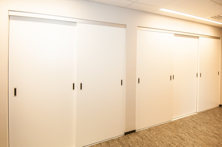 Innherred Helsehus - Levanger I.nr.: 50411 - Fil: BSC_9711 Her har vi et garderobeskap med store skyvdører. Design:Letnes Arkitektkontor AS Foto:Johan Martin Lium Kunde:Kontor Design AS Filter Garderobe Forrige Tilbake Neste