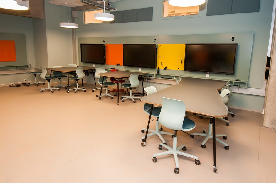 "Interaktive studentarbeidsplasser er en del av NTNUs pilotprosjekter. Dette prosjektet skal undersøke hvordan under visningsrom på flatt gulv kan designes for mer variert undervisning hvor det veksles mellom formidling og gruppearbeid." (Eggen Arkitekter)