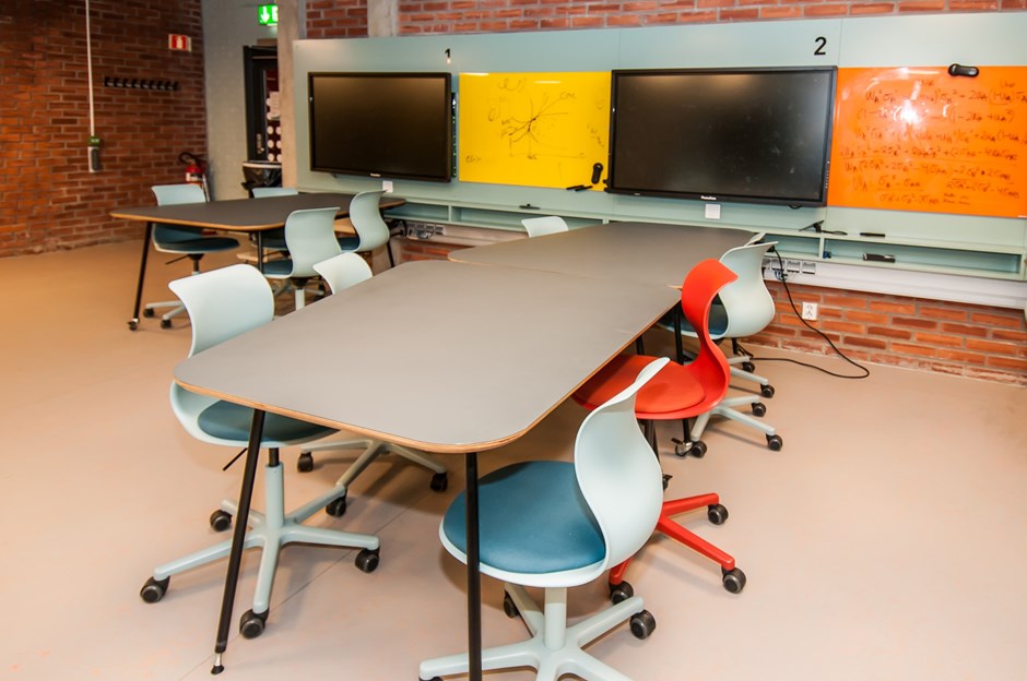 "Å prøve ut ny teknologi i form av interaktive skjermer og deling av skjermer har vært viktig. De interaktive skjermene er montert på veggen som omkranser rommet. (EggenArkitekter)