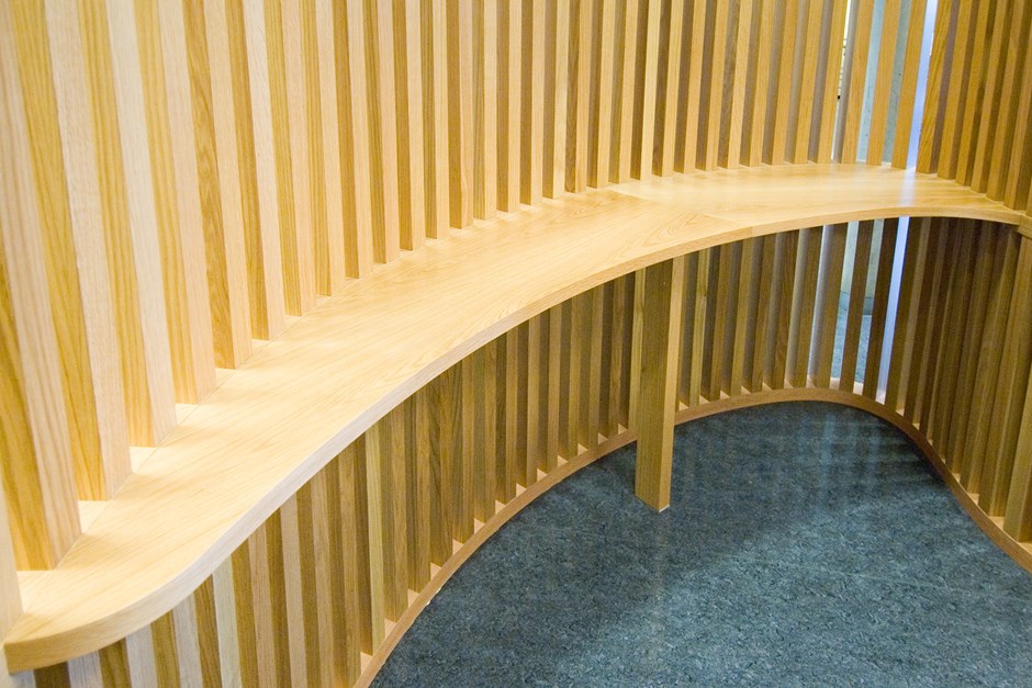 33181 9090 Buet vegg i eik Veggelement i eik som skillevegg i bibliotek. Design:OLM/Kunde Forrige Tilbake Neste