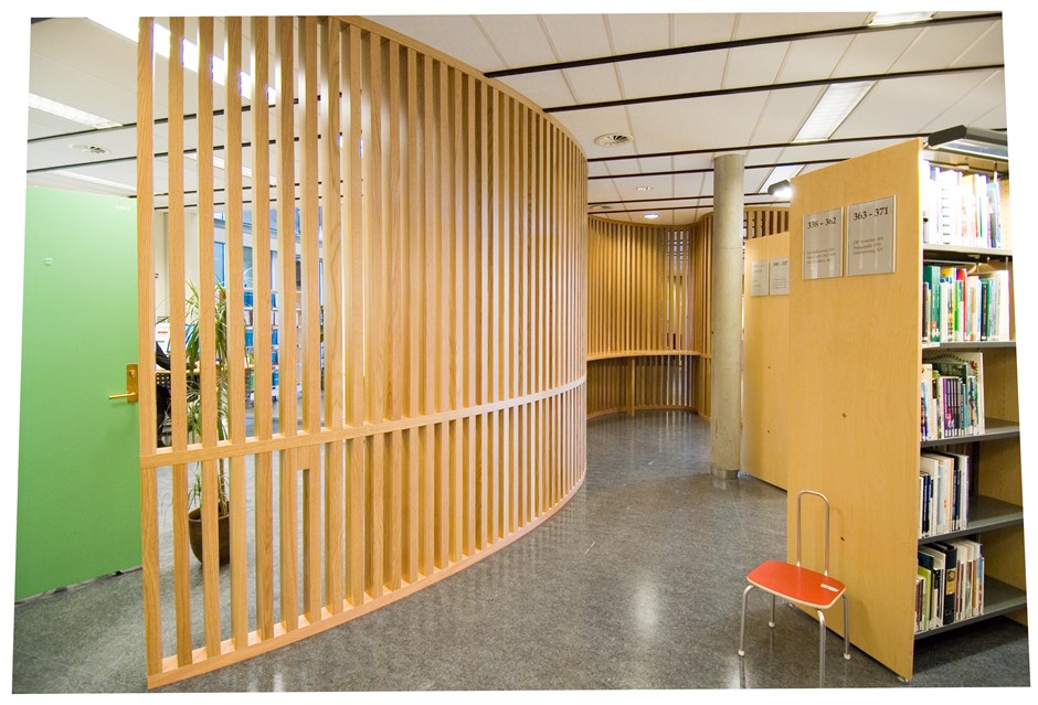 33181 9091 Buet vegg i eik Veggelement i eik som skillevegg i bibliotek. Design:OLM/Kunde Forrige Tilbake Neste