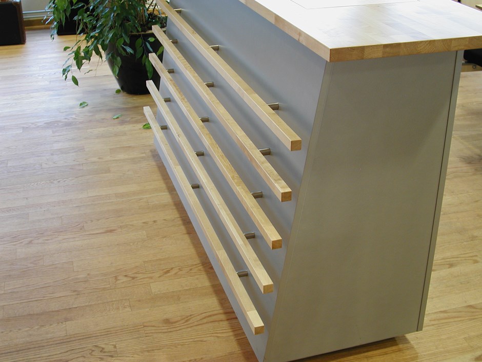 Blomsterkasse/romdeler. Pyntelister i front i bøk med rustfritt stål i distansehylser. Design:kunde/olm Forrige Tilbake Neste