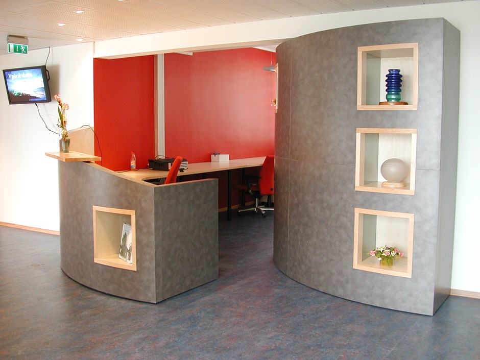7828 Resepsjonsløsning. Skranke og tilhørende vegg med utstillingsmontere. Opalglass og belysning i kassene. Overflate i Formica PSM plastlaminat. Design:Arkitektene VIS-À-VIS Trondheim. Forrige Tilbake Neste