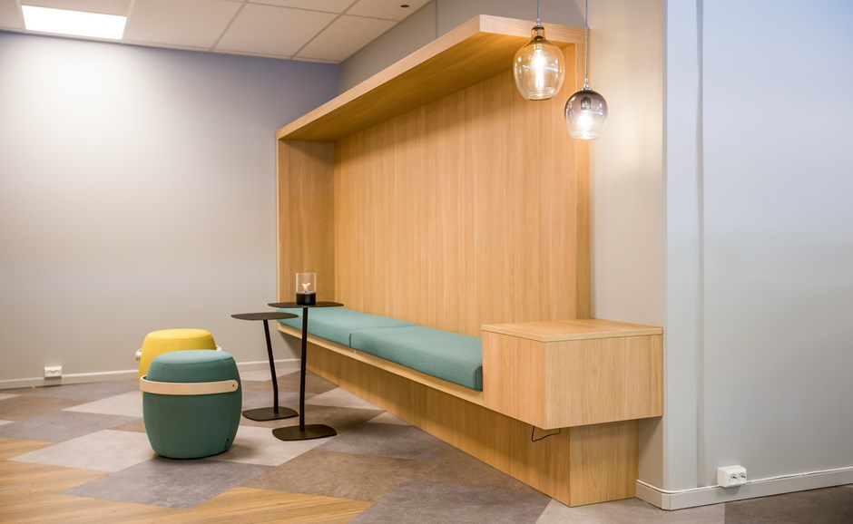 Ullevål Stadion Business Center - UBC I.nr.: 52998 - Fil: vi0a4742-copy-6 Dette bildet viser en av flere sofanisjer. Møblene er levert belagt med Formica eik høytrykkslaminat F-5374 NAT og kantet med 2 mm ABS lister. I barbord og sofanisjer er det montert Qi lader for mobiltelefoner. Design:Totalreform Foto:Krystian Gregorczyk Kunde:Idema AS Forrige Tilbake Neste