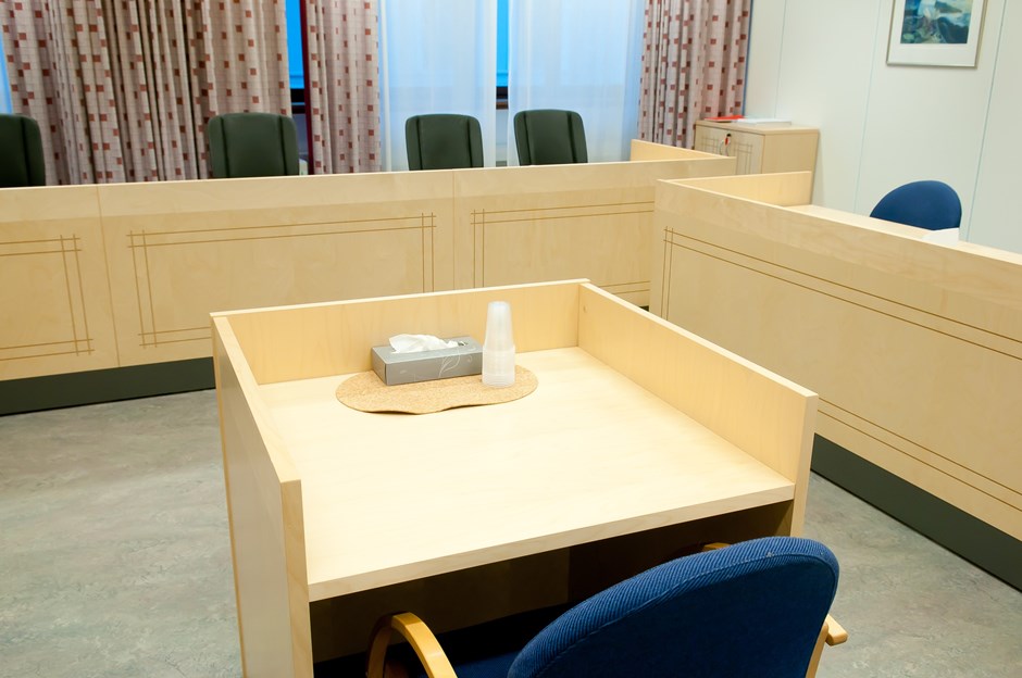36546 9429 Rettssal 5 Fylkesnevnda Oslo - Vitneboks Rettssalsmøbler utført i bjørk. Flere av bordene har el hev/senk samt nedfelt bokser for el tele og data. Det er medlevert skap for oppbevaring. Design:OLM/Kunde Forrige Tilbake Neste