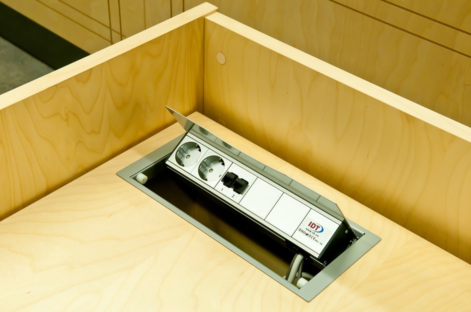 36546 9449 Rettssal 5 Fylkesnevnda Oslo - El tele data tilkobling Rettssalsmøbler utført i bjørk. Flere av bordene har el hev/senk samt nedfelt bokser for el tele og data. Det er medlevert skap for oppbevaring. Design:OLM/Kunde Forrige Tilbake Neste